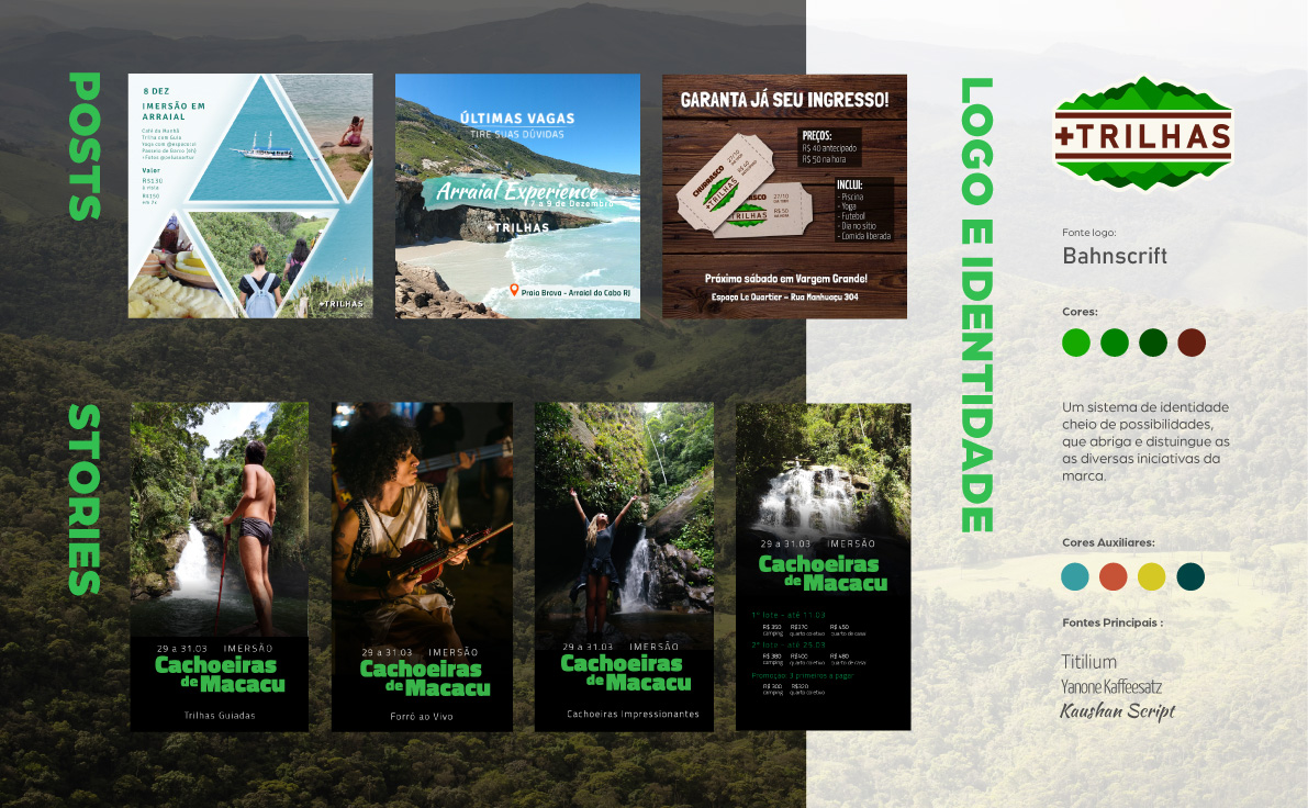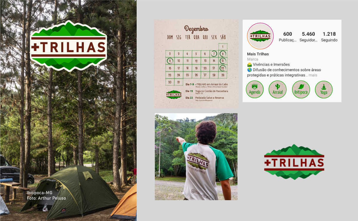 Fui chamado para fazer a identidade visual do Mais Trilhas quando este dava os primeiros passos para se tornar uma empresa de ecoturismo. Até então era um grupo de trilhas chamado “Mais Trilhas Por Favor”. Uma das primeiras ações foi a redução do nome para que ele fosse mais simples, aplicável e fixante. A logo criada tem significado auto-explicativo, colocando a marca em meio ao caminho cercado de natureza, trazendo foco para a experiência da trilha. As cores remetem aos ideias da marca profundamente ligada a preservação do meio ambiente, conexão com a natureza, evolução pessoal.